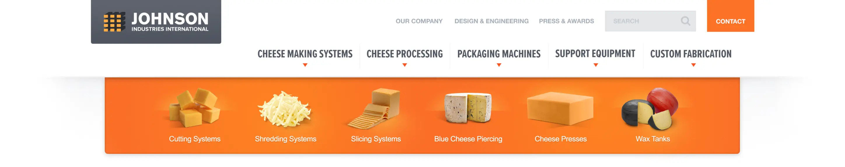 Johnson Industries International had a ton of product lines, subproducts, and accessory equipment to feature on its site. In researching how to design the main nav, we found that the websites of similar equipment manufacturers were especially hard to navigate, often with three (or even four) levels of navigation.