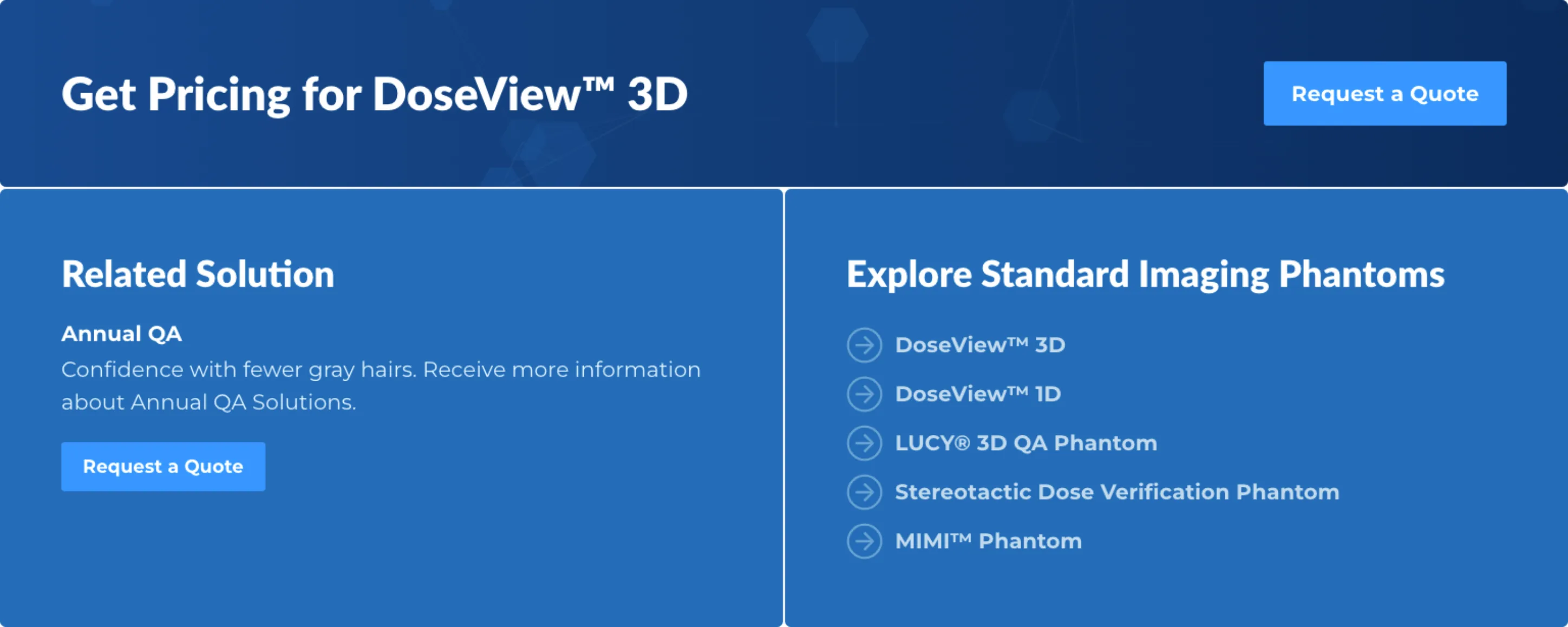 Next, using Craft Commerce, we developed a quote request system to let customers add multiple products to their cart before contacting Standard Imaging for pricing. We also incorporated the ability to request information on broader solutions, for example Monthly QA, which often include a range of products and services tailored to the customer's business.
